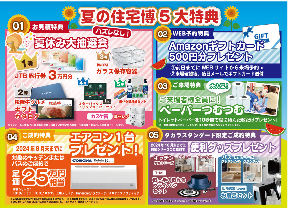 今回はお見積り依頼をいただいた方には豪華賞品が当たる夏休み抽選会、ご来場者様には大人気のペーパーつむつむへの参加などわくわくする特典をご用意しました!