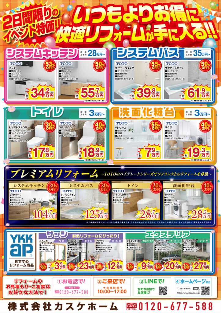 キッチン、システムバスをはじめ、サッシやエクステリアまでTOTO・YKK APの人気商品をこのイベントだけの特別価格でご用意しました。