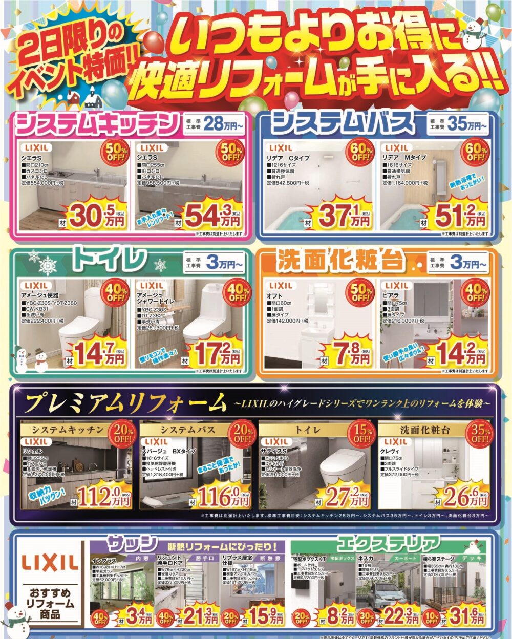 今回はLIXILのキッチン、システムバスなどの水まわりを2日間限りのイベント特価でご用意しました。