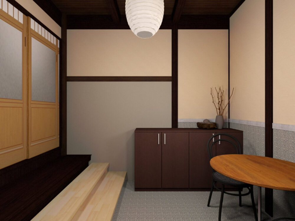 風情ある広い土間玄関はそのまま活かし、式台の段差には造作の踏み台を、さらに収納も設置しました。年齢を重ねても暮らしやすいバリアフリーの住まいです。