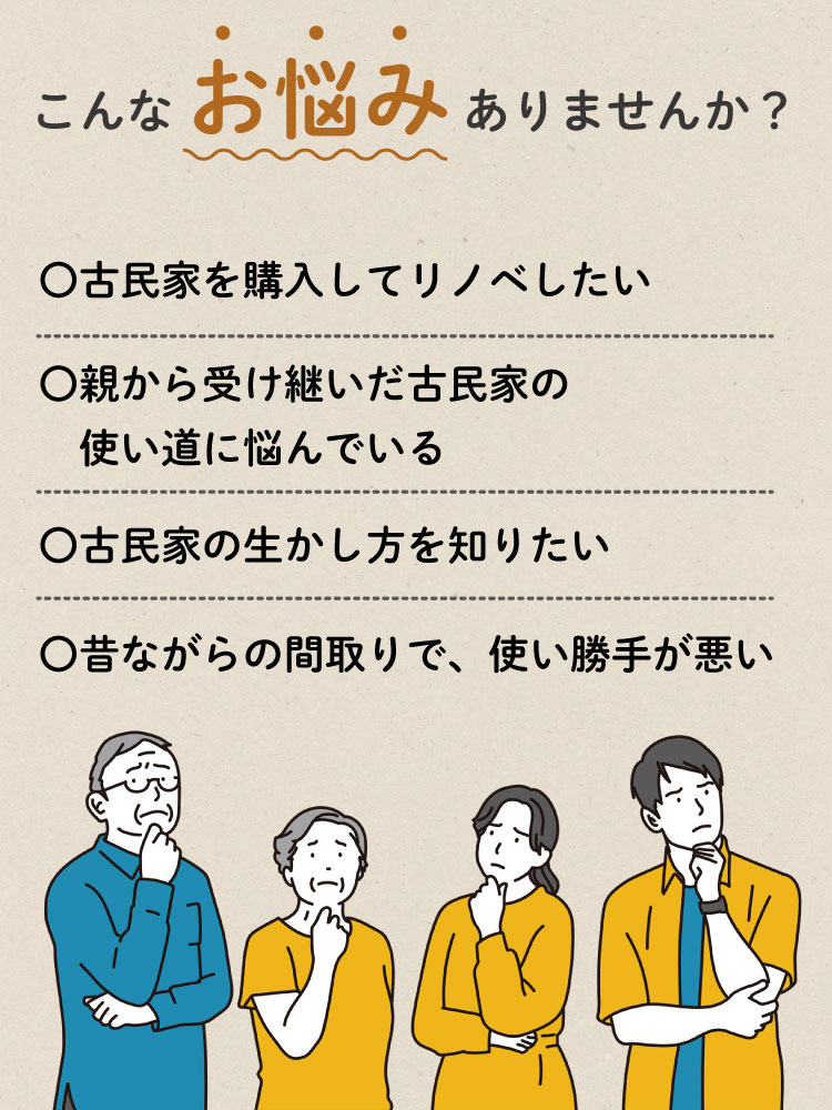 「空き家になった古民家をどうにかしたい」、「暮らしやすくリノベーションしたい」、「シロアリが気になる」などなど古民家を持たれている方には、多くの悩みがあります。