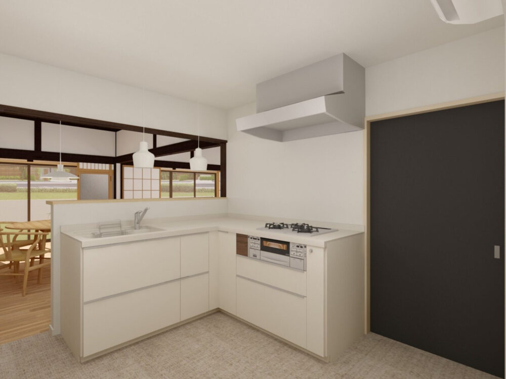 水まわりを一か所にまとめ、家事効率がアップ。寝室もリビング横に配置し、勝手口の位置も駐車場に合わせて変更することで、動線も快適に。将来も安心な平屋暮らしが実現します。