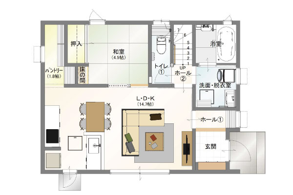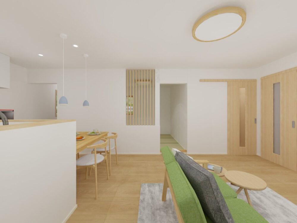 ご希望の和室はLDK横に配置し、格子で明るさと開放感を確保。