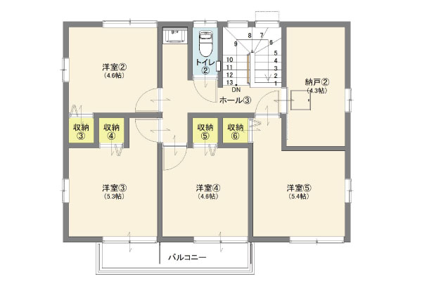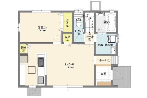 2×4構造で大きな間取り変更が難しい中、収納を強化し、各部屋の収納やパントリー、2階にはファミリークローゼットと納戸を計画。
