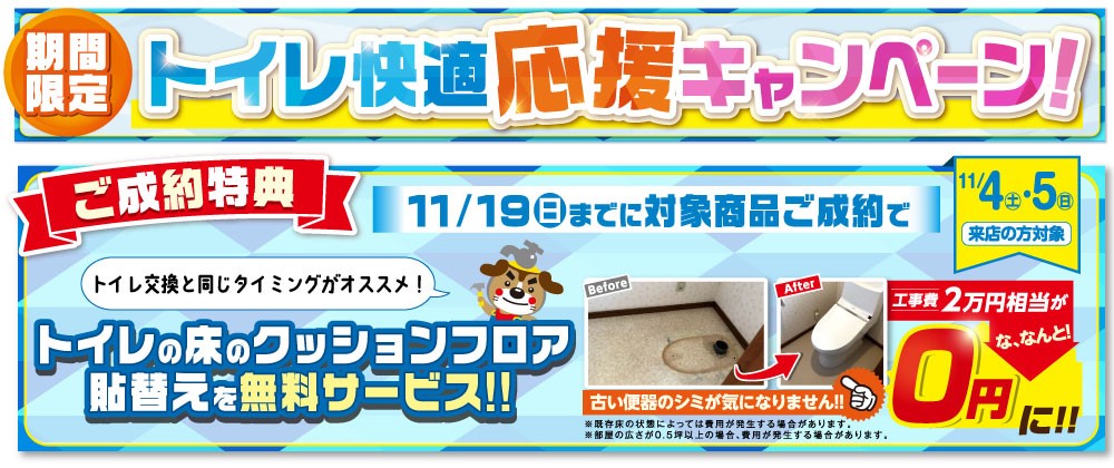 11/4・5の相談会にご来場いただき、11/19(日)までに対象商品をご成約いただいた方に「トイレ床のクッションフロア貼替え」を、通常工事費2万円相当を無料サービスさせていただきます!