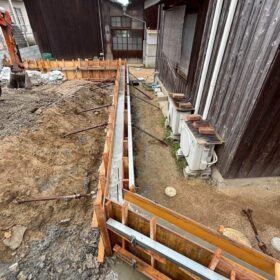 工務部の三野です。 フェンス新設するために擁壁をつくっています。 鉄筋・型枠を組み、コンクリートを流し込む前になります。
