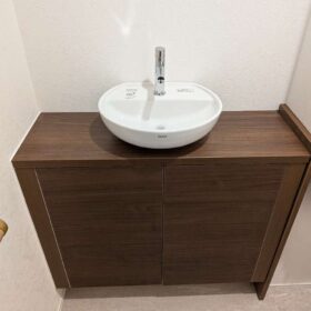 工務部の三野です。 『キャパシア』という造作のトイレ手洗いキャビネットを新設しました。 写真右側エンドパネルは建具屋さんに製作して頂きました。 初見でしたが、良い製品だなと実感しました。