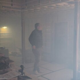 工務部の森永です。ただいま工事中の現場で気密測定を行いました。人体に害のないスモークを発生させて空気の流れを確認しました。
