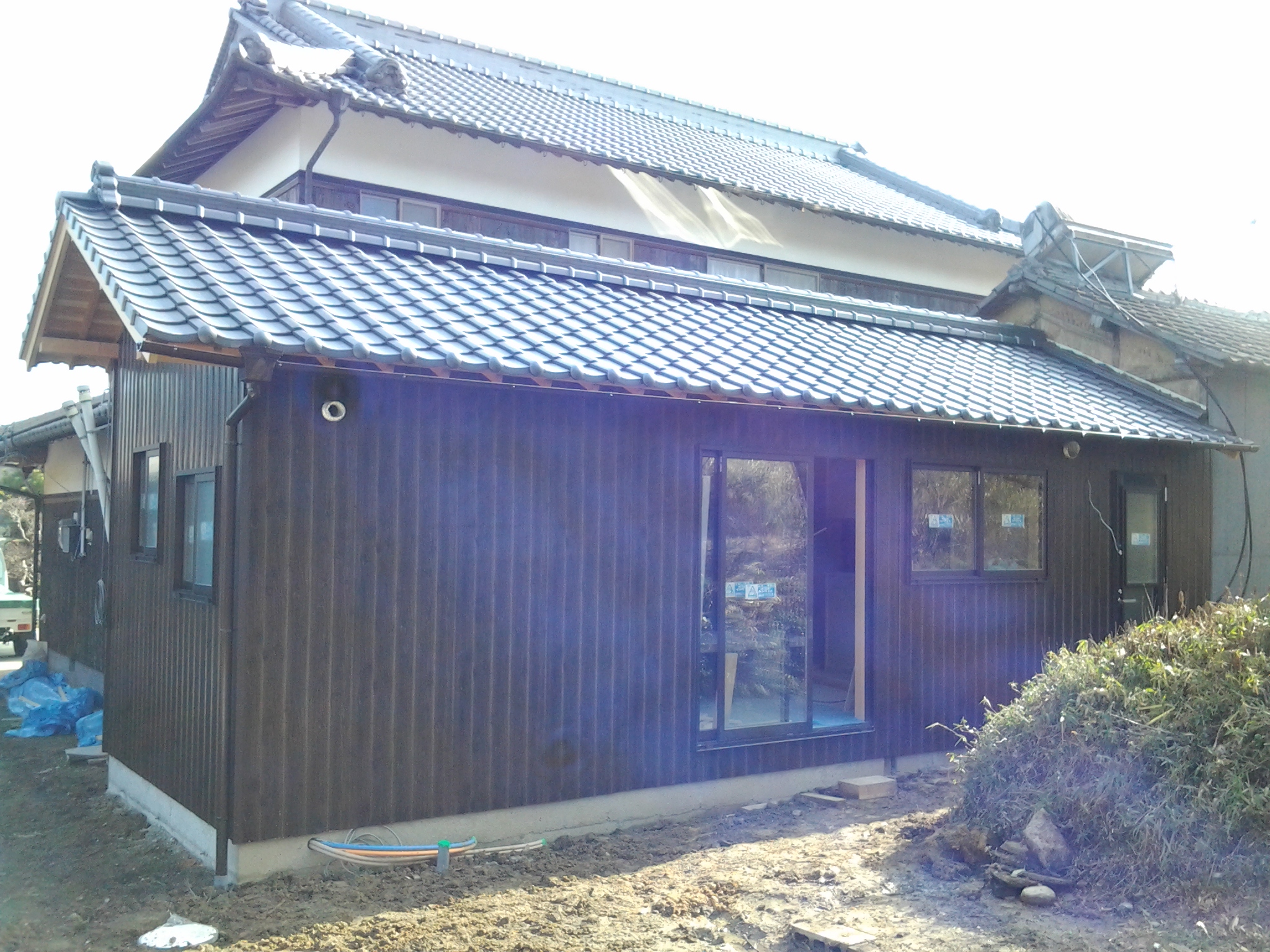 外壁が出来ました。今回はプリント鋼板で仕上げました。雰囲気も母屋と合っていい感じです。