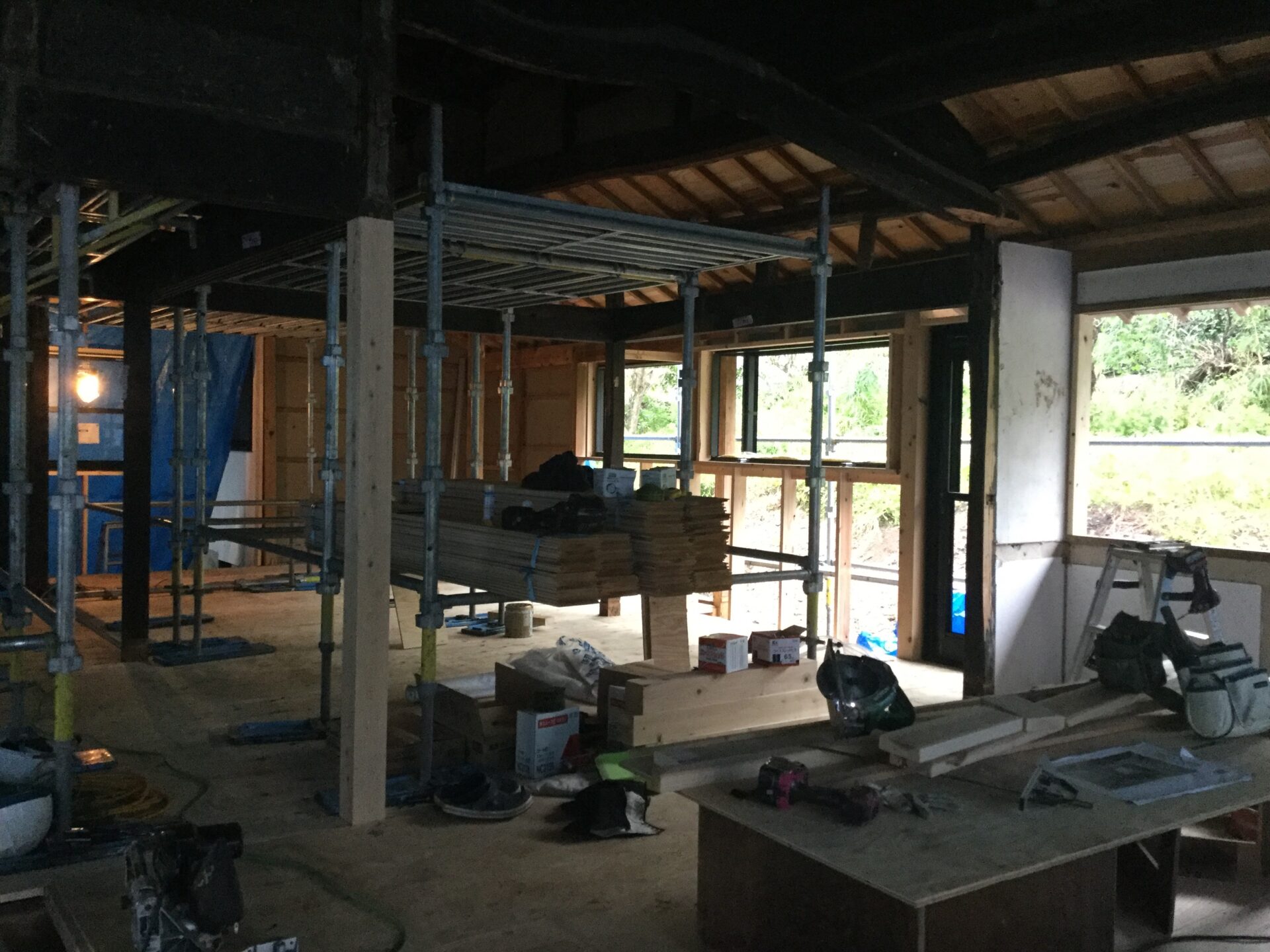古民家再生です。 天井を魅力的にするために面白い施工をするのですが天井高が3800mmになるために内部足場を組みました。 原田