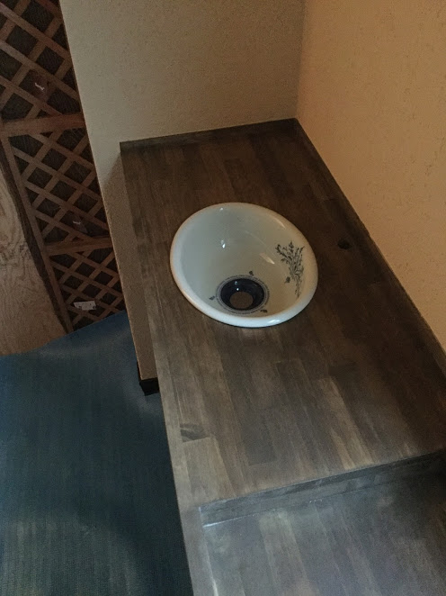 今週末完工予定です。壁天井はアイカのジョリパットを左官屋さんに仕上げてもらいました。造作のカウンターにはお客様支給の手洗いボールが付きます。森永