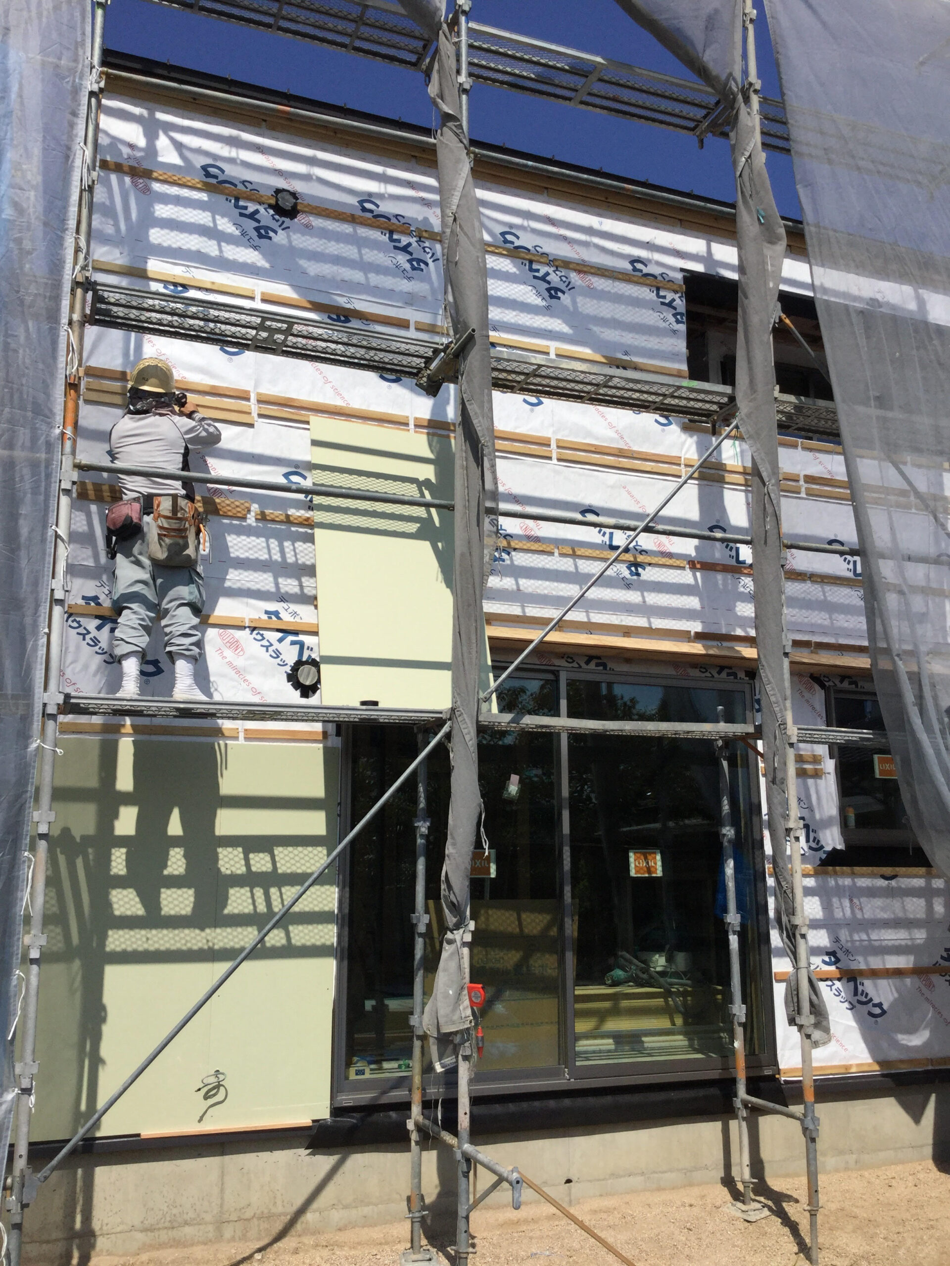 只今外壁工事中です。耐水ボード貼っています。佐々木