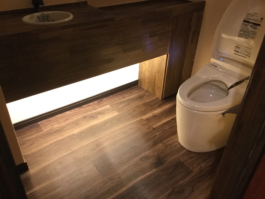 器具付けも済んで掃除も済みました。完成です!!お客様の希望通りに仕上りました。写真は造作カウンター下の間接照明を照らしてみました(V)o¥o(V) /森永
