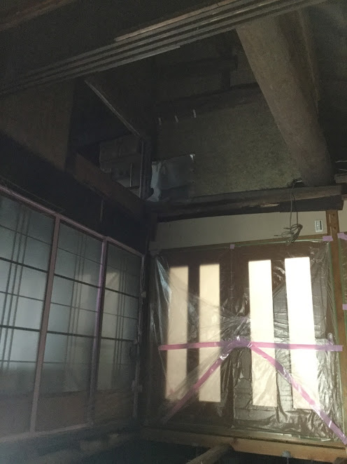 内部の解体が進んでいます。大きな丸太の梁が現れました。森永