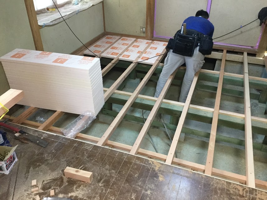 床下の断熱材を施工しています。写真は大工さんが施工していますが実際はチャレンジワークに来てくれていた中学生2人に施工してもらいました。大工さんの話をしっかりきいて隙間なく施工してくれました。森永