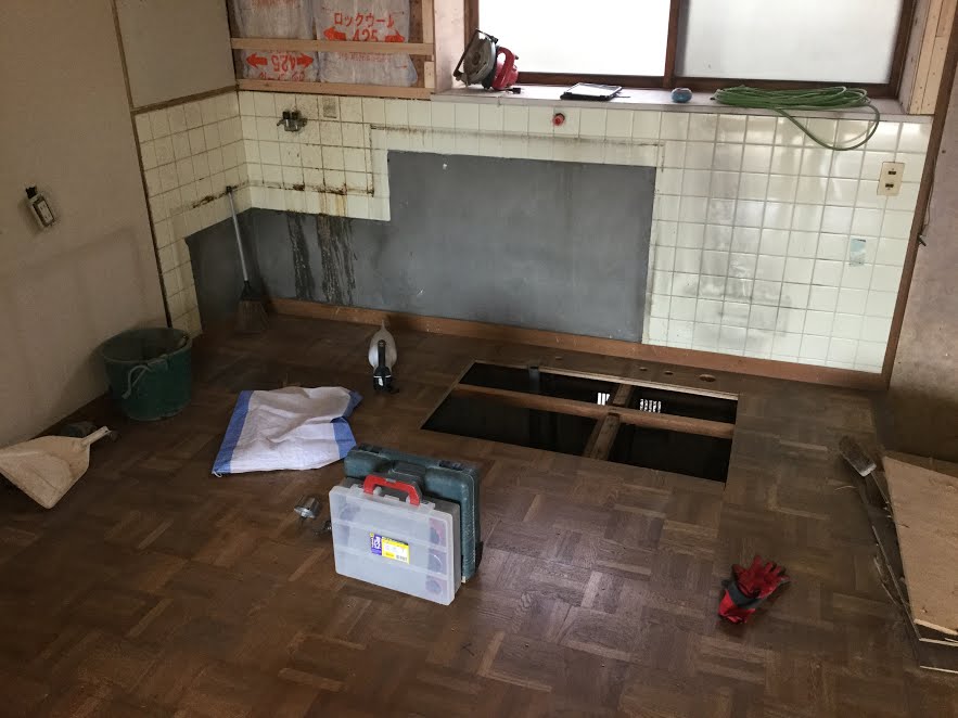 水廻りに工事をしています。既存キッチン撤去後床を切って給水給湯排水の仕込みをしています。新しくLIXILのキッチンを設置する為、既存位置だと合わない為にやり直しをしています。キッチンを替えるだけでも置き替えるだけではなくキッチンにあった配管のやり替えも必要になります。森永