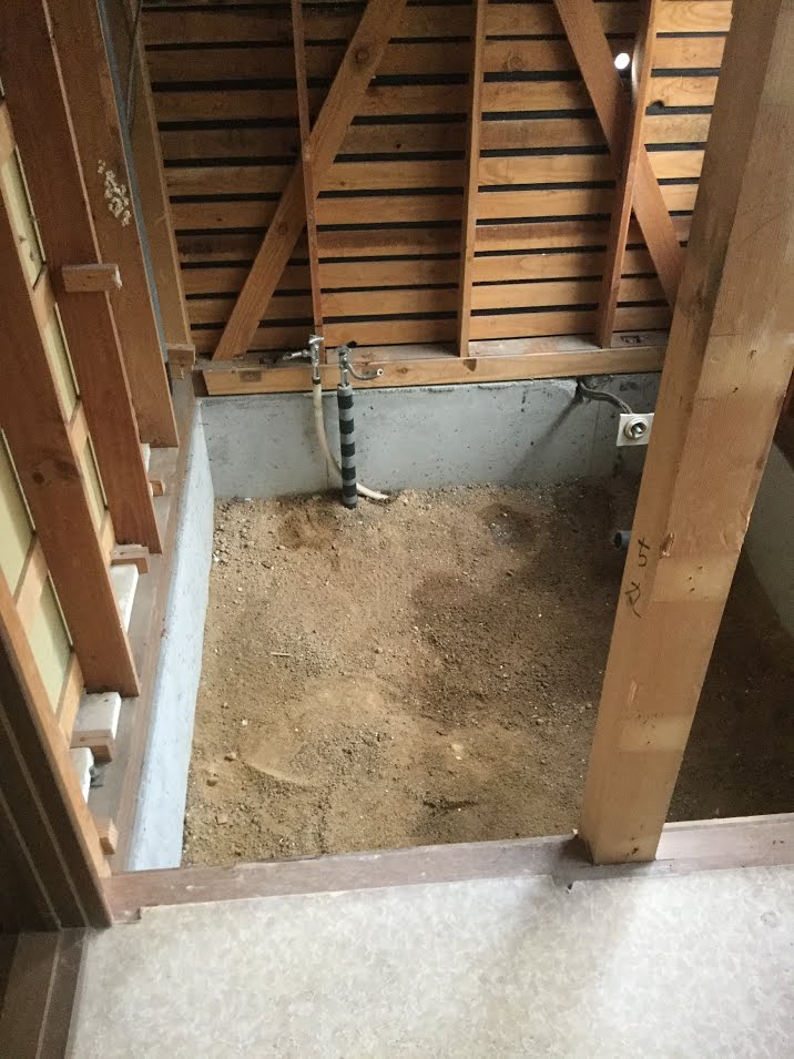 昨日より中古改修工事が始まりました。水廻りを新しくして家全体のクロス張替です。ユニットバスからユニットバスへの工事ですが既存の床下が土だった為、新規でコンクリート土間を打って設置します。森永