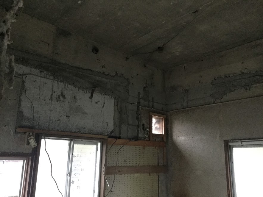 解体が進んでいます。内部の仕上げ材を撤去して使える下地材は残して、使えない下地材は撤去して新しく施工します。森永