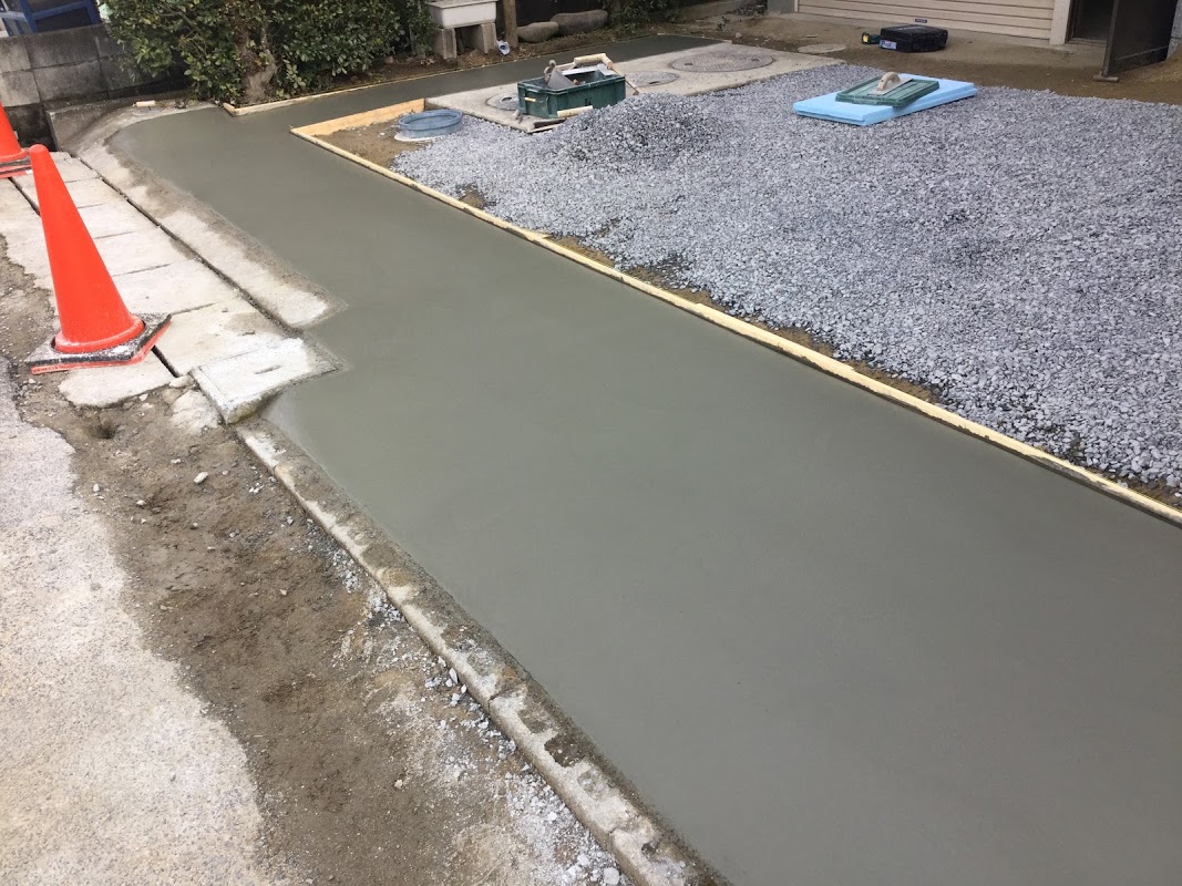 現在、車の入口の沿ってコンクリートを流しています。
