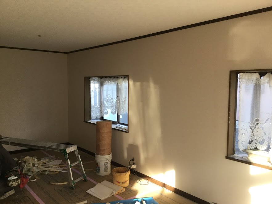 クロス工事が本日完了しました。約12帖間のLD貼替でしたが職人が2人入ってくれて1日で作業が終われました。残るは電気・水道の仕上げ工事です。あと少し宜しくお願いします。森永