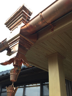 過去のお客様ですが玄関ひさしに樋を設置させてもらいました。銅板を使用してあり設置直後は光り輝いています。集水器もひときわ目立っています。色もやがて落ち着いてきてお寺や神社などで見ることのある緑色になっていきます。【別名:マジンガー】と言ってる方もいます(笑)。森永