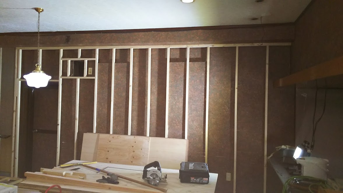 壁の下地を組んでいます。この上に石膏ボードを施工してクロスを貼るようになります。森永