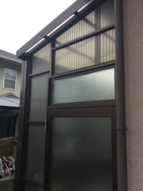 バックヤード入り口にドアを付けました。今まで解放されていて浴室窓が外部から丸見えだった為、目隠しで提案させてもらい、本日設置しました。森永