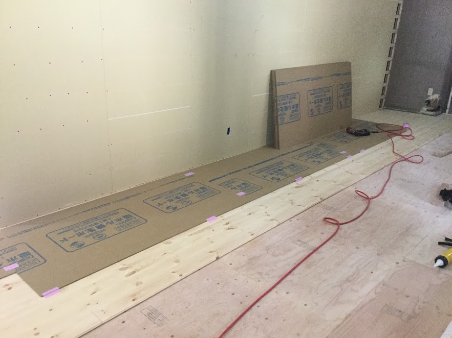 パインの床材を施工開始しました。約4mの一枚物の床材を一枚ずつ丁寧に施工していきます。無塗装品ですので仕上げは保護の為、塗装仕上げです。森永
