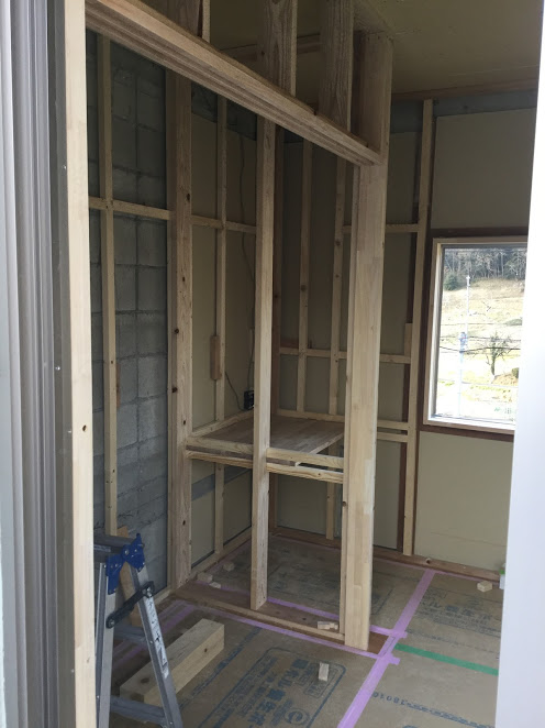 押し入れの下地組をしています。奥に見えるはお客様の希望でカウンターを固定しています。机を置かなくても勉強等できるようにです。材料はタモの積層板で仕上りはクリア塗装の予定です。森永