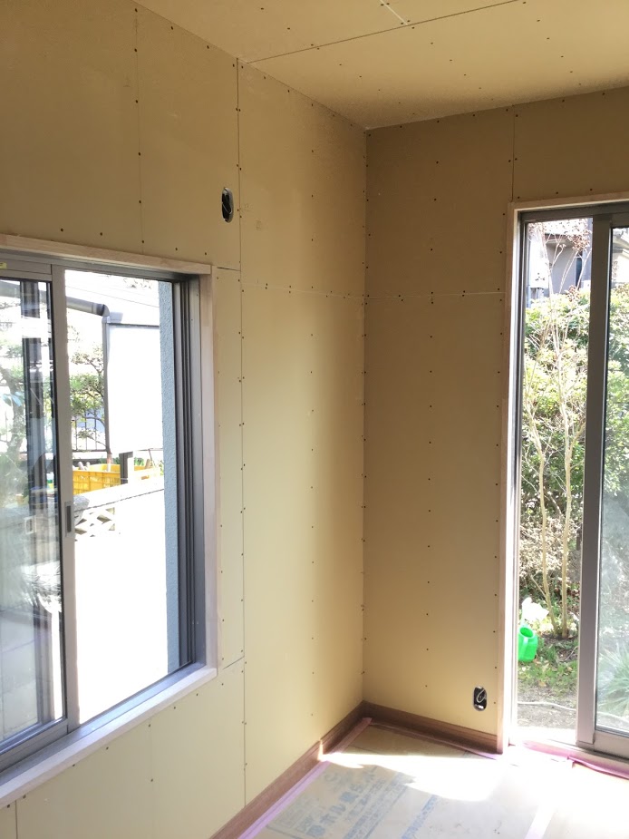 大工工事が終わりかけています。次の作業は無垢の木材の塗装、そしてクロス工事です。クロス工事の前にコンセントやスイッチが付く場所は石膏ボードに事前に穴を開けておきます。この状態で確認が出来ていれば違っていてもまだ直せますよね。森永