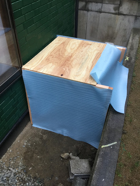 写真を見てもわかりませんが、この中にはエコキュートのタンク設置台を左官屋さんに施工してもらっています。あいにくの雨の為、雨よけの為に箱を組みました。森永