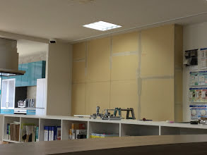 昨日より大工が入り店舗内の改装工事をしています。今日は内装屋さんがクロスを貼ってくれます。今下地処理中です。森永