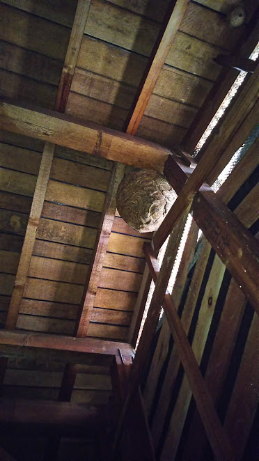 雨漏りの調査をしていたら立派なハチの巣を見つけました。いつ作られた物かはわかりませんが大きいです。いないとわかっていても近寄りがたいですね…。森永