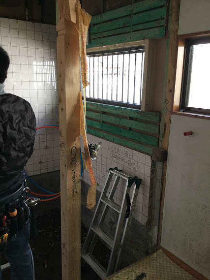 電気屋さんが配線を、大工さんが浴室の新しい窓を設置してくれています。森永