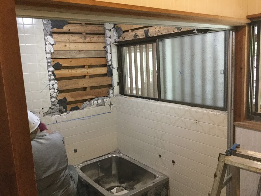 浴室の解体が進んでいます。新しく入るユニットバスが納まるように既存のタイルを剥がしています。案件によっては費用を下げる為に不要な解体をしない場合がありますが、今回の場合はスペースがギリギリの為、解体しています。森永