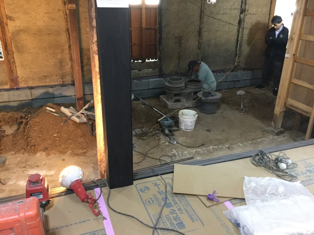 外壁側の柱が虫に食われて強度が無くなっていましたので、宅内側にもう一枚補強の為の壁を新設します。今日は基礎屋さんにブロック基礎を施工してもらっています。森永