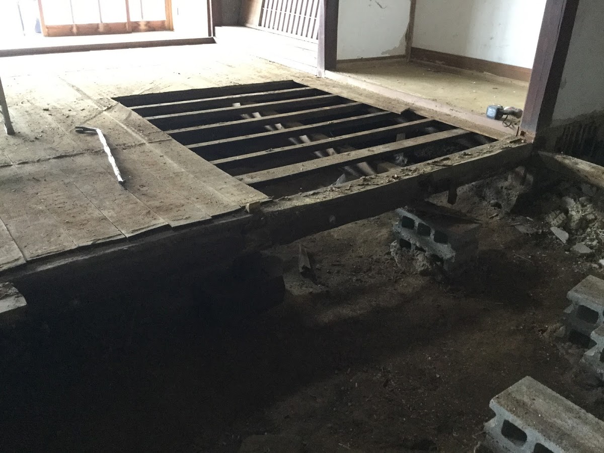 解体がまだまだ続いています。内部の解体が終盤に近付き始めました。土台が湿気と白アリの被害で木の中身がグスグスになっています。新しい土台と差し替え工事が必要になっています。森永
