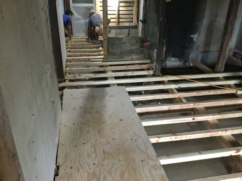 解体が外部に移りました。本日より大工さんが入りまして床を上げていってます。悪い材料は撤去して新しい物に交換していきます。今回浴室工事がありませんのでお客様が現在も使用中です。解体してしまったら足元が土間になってしまいますので歩けるように先行して作業に入ってもらいました。森永