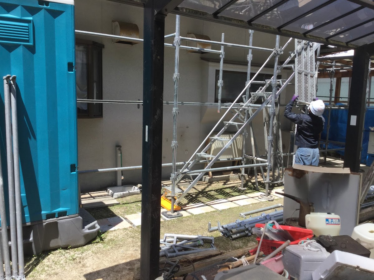 内部の水廻り工事が終わりました。今日から外部の工事に入ります。足場屋さんが外壁塗装がしやすいように足場を組んでくれています。森永
