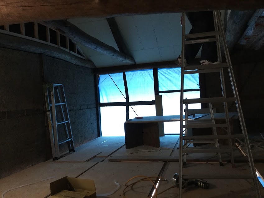 小屋裏が吹き抜けになるので断熱材を入れて石膏ボードで塞いでいます。吹き抜け部分には足場板をかけて作業しやすくしています。作業が終われば一階から吹き抜けを見上げることができます。前は隠れてしまっていた合掌もばっちり見えます。森永