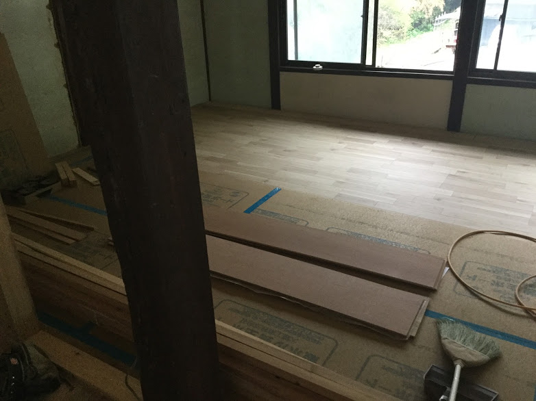 床材を施工しています。今回採用された床材はikutaの銘木フロアーラスティックのナラ樫です。天然木の突板が使用されており杢目が同じ物はありません。森永 ※突板とは無垢材を薄くスライスした物