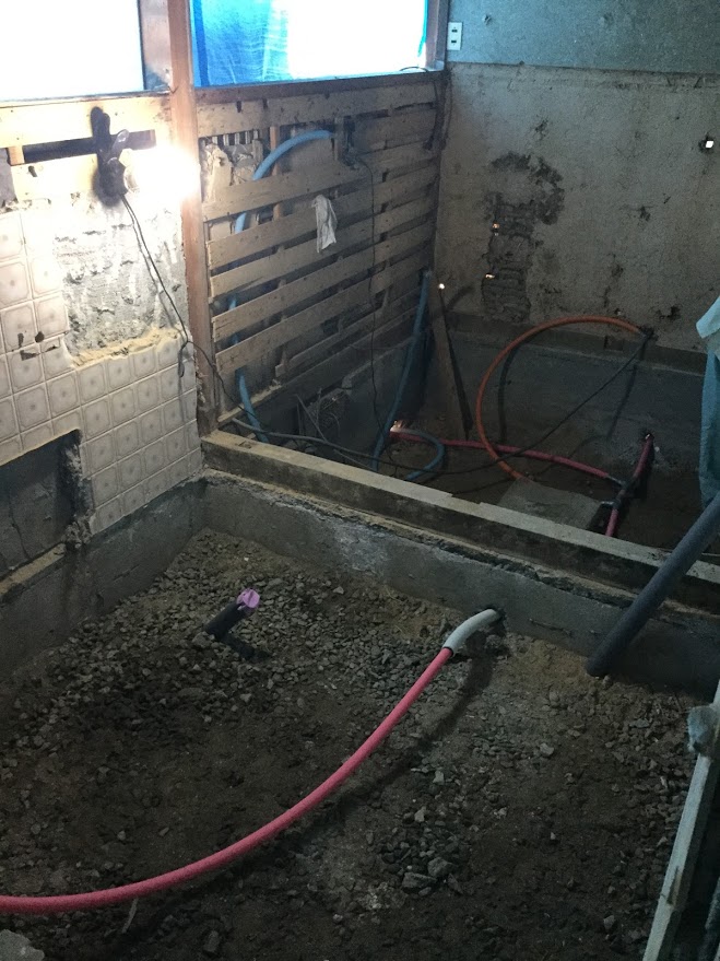 水道屋さんに入ってもらってます。解体が終わりましたので給水・排水菅を仕込んでくれています。森永