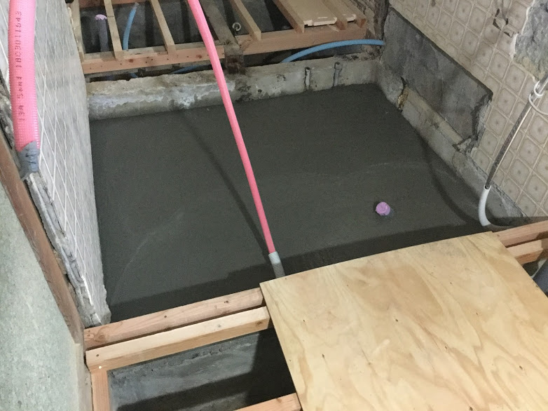 ユニットバスを設置する為の土間打ちをしました。ユニットバスを設置するには必ず施工します。メーカーによってユニットバスを支える為の足の長さが違います。アジャスト付きで微調整できる物、出来ないものがあります。商品に合わせて土間の高さを変えます。森永