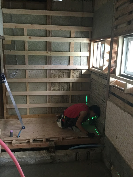 レーザーを使ってレベルの確認をしてくれています。柱の傾きなどを見て壁の下地を調整していきます。今回は非常に良くて調整がいらないようでした。森永