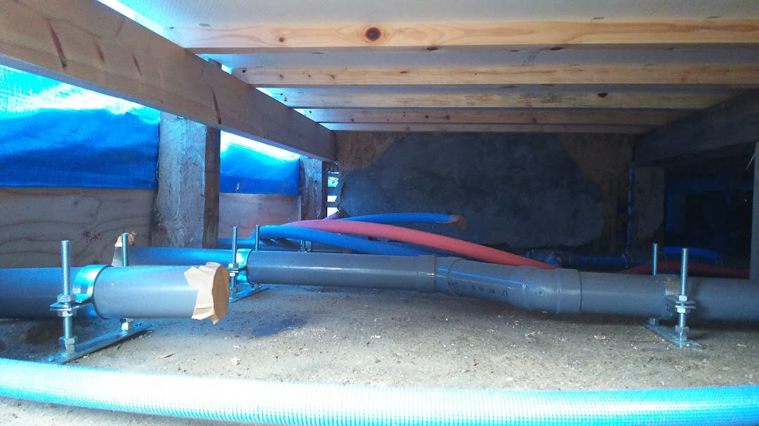 配管工事をしてもらっています。床を上げる前に先行して仕込んでいました。床が出来ると細かい位置決めをして、そこに立ち上げるようになっています。森永