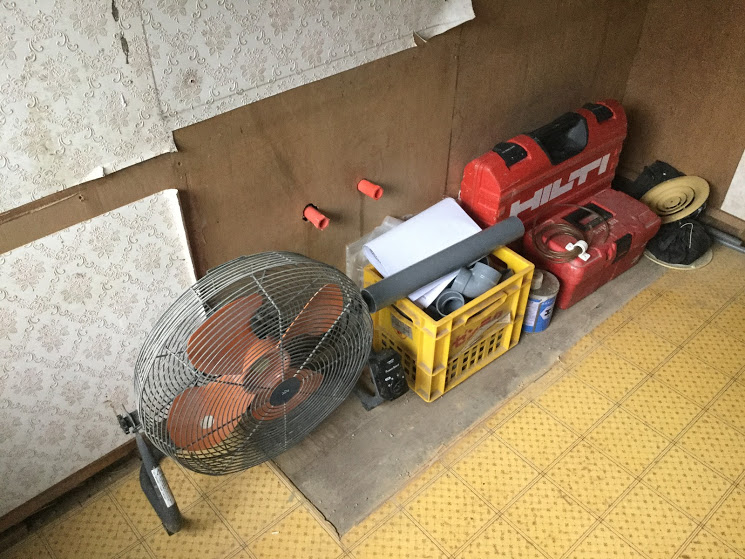 今日も大工さんが作業しています。本日は水道屋さんも入る予定でしたが、大雨の為、消防に呼ばれて出動中。工事は入っていませんが、道具は一まとめに整理されています。森永