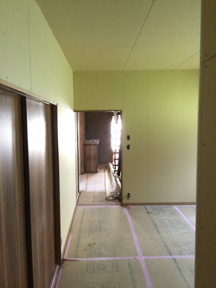 大工作業も終わり、内部の木部塗装も終わりました。今度は内装工事!クロス工事です。森永
