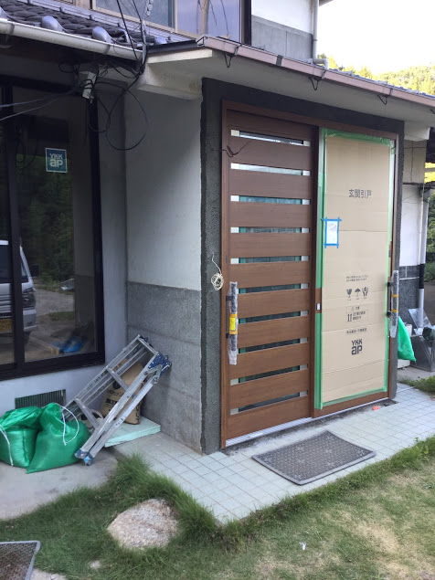 玄関引戸の交換工事をしています。今回はカバー工法ではなく完全に既存サッシを取り外して新しい玄関を施工しました。森永