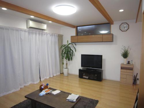 内装も全部やり変えています。テレビの上の収納が、良いアクセントになっています。