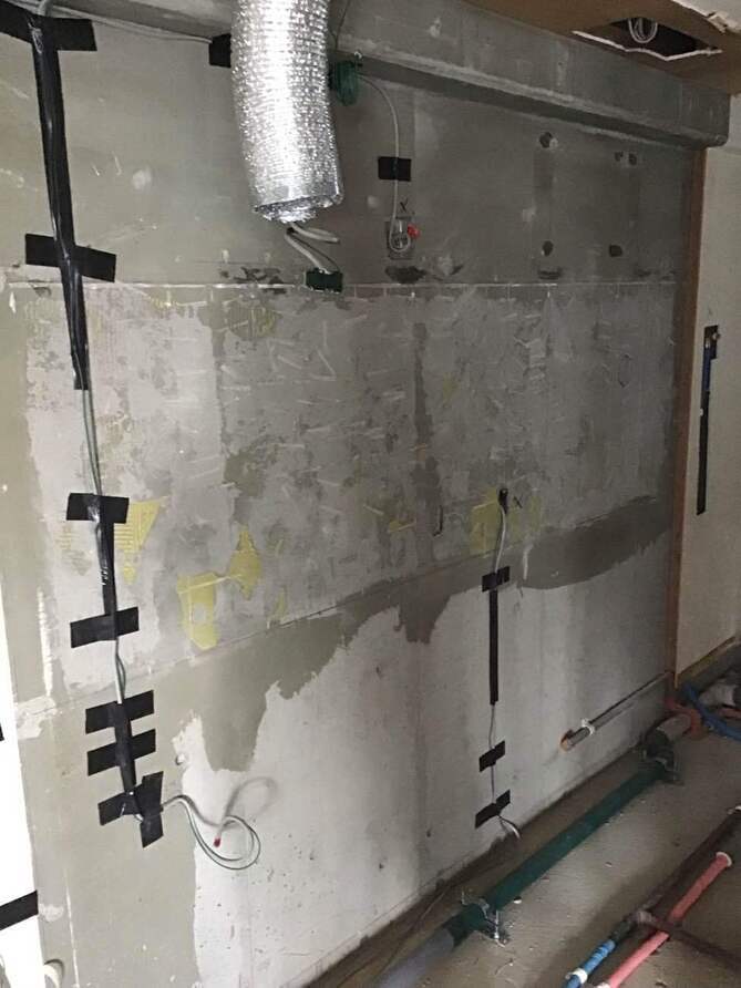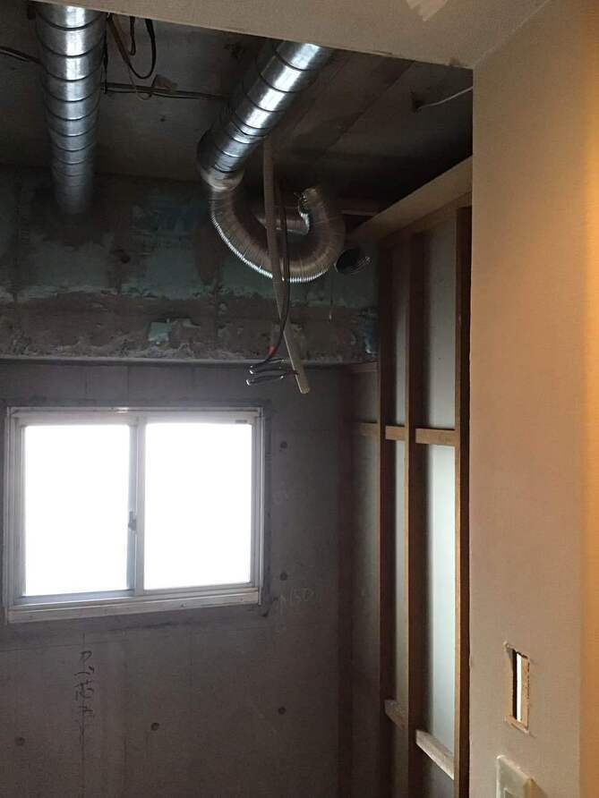 既存のキッチンが設置されていた場所になります。 こちらも外壁部分は壊すことができないので、梁下まで壁をふかしてキッチンを取り付けていきます。
